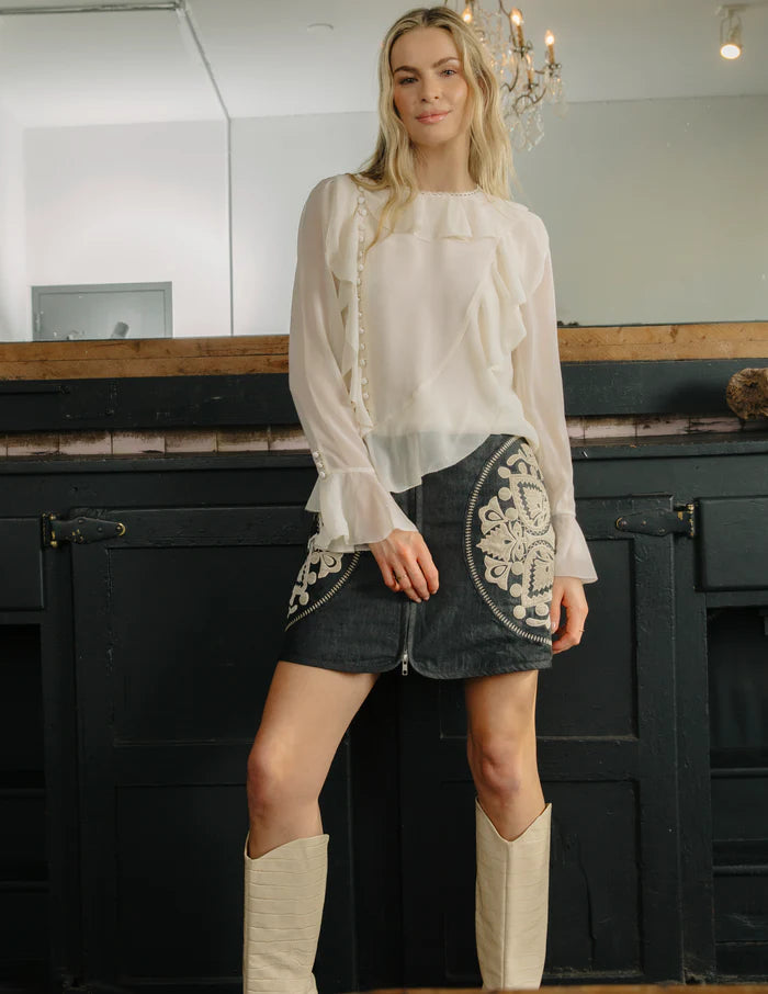 - The Ayla Skirt is a standout piece featuring enlarged velvet ivory applique that adds a modern artisanal touch to a classic silhouette. With its front zip closure and flattering fit the Ayla Skirt transitions seamlessly from daywear to evening style.