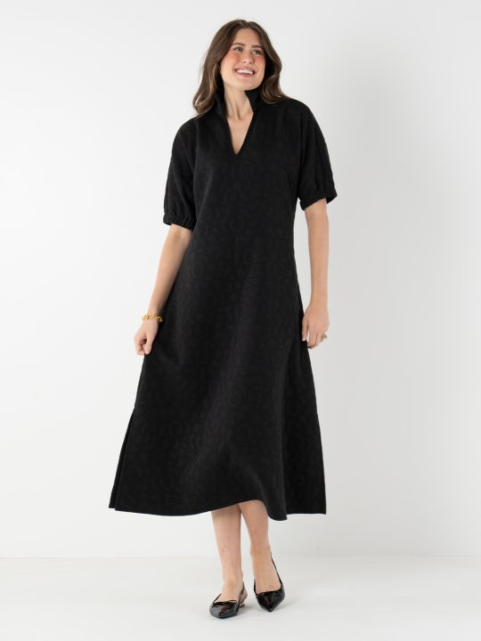 The Poppy Maxi in Black Cheetah brings unique texture and elevated ease to everyday dressing. Designed with a classic stand collar, loose elastic dolman sleeves, and a relaxed silhouette, this style offers both comfort and polish. The embossed cheetah texture adds just the right amount of detail, creating visual interest while maintaining versatility. Soft and plush to the touch, this dress moves with you and transitions seamlessly from casual errands to weekend plans. A go-to piece for laid-back sophistication.