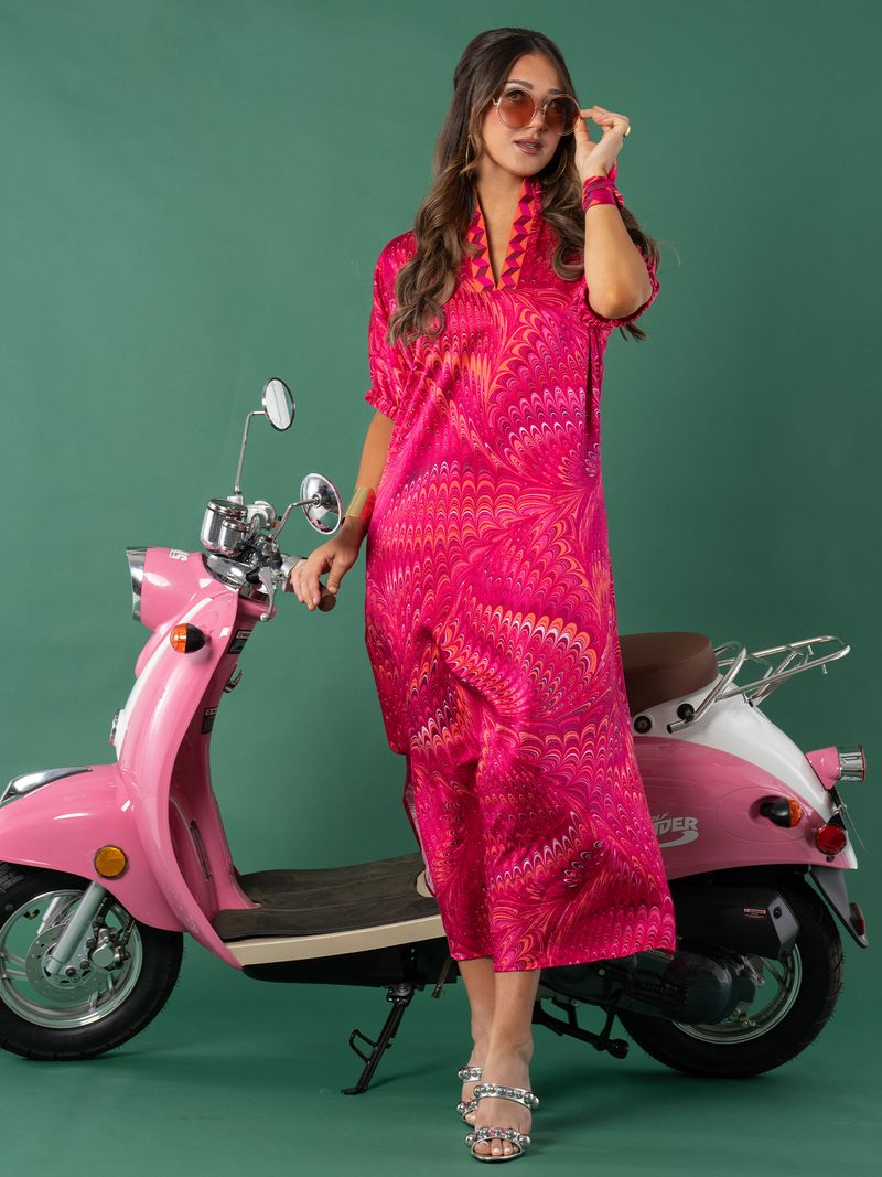 The Poppy Maxi in Venetian features a classic stand collar and loose elastic dolman sleeves for an effortlessly chic fit. Designed with side pockets and a flowing silhouette, this style is finished with a curved tail hem for graceful movement and a relaxed yet polished look. The Venetian print is a statement pattern bringing vibrant dimension and artistic flair to the timeless caftan silhouette.