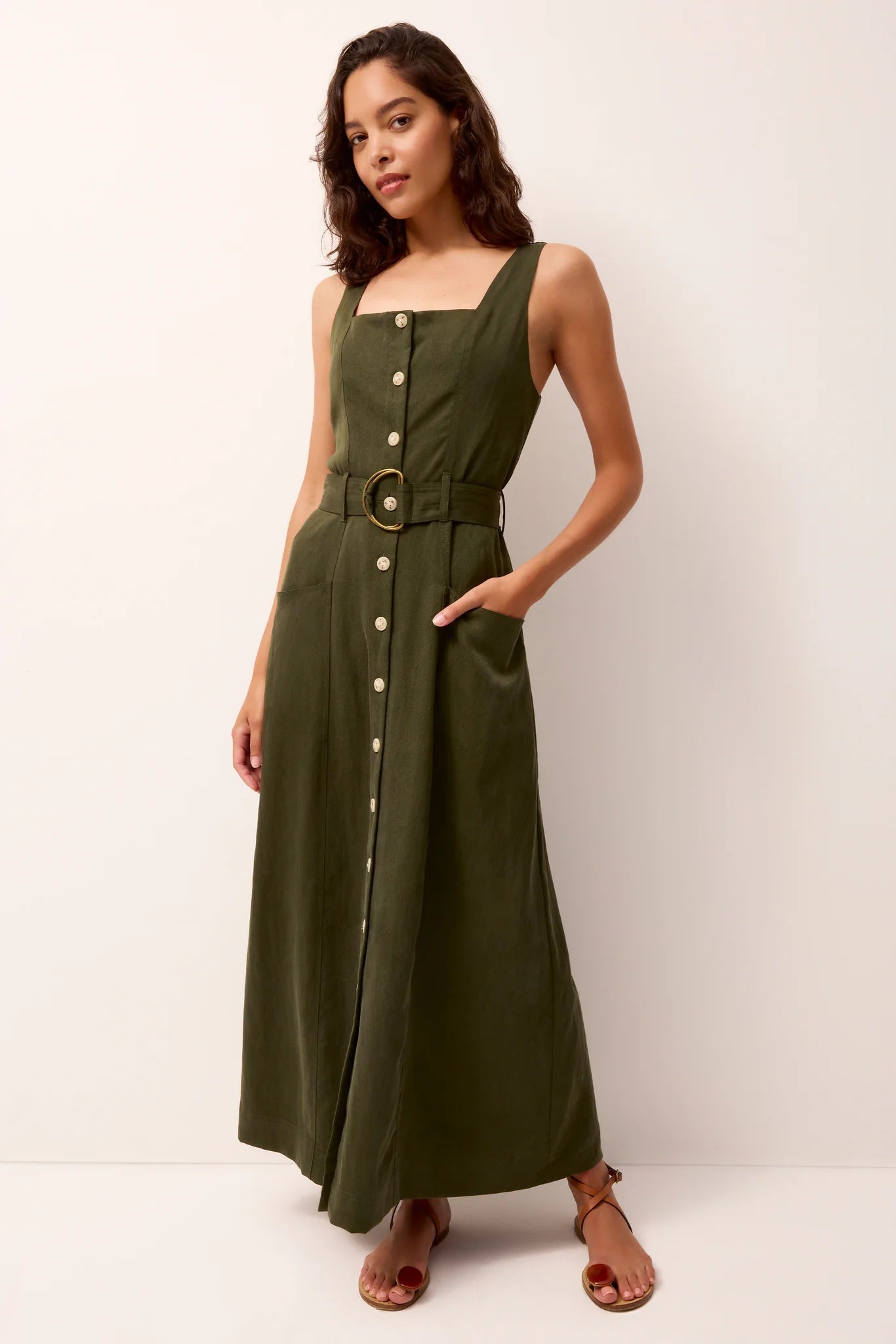 Equal parts polished and practical, this soft yet structured sundress features a button-front placket, apron-style pockets, and a bra-friendly silhouette. Rendered in a rich moss green, the easy midi length transitions seamlessly from late summer into early fall.