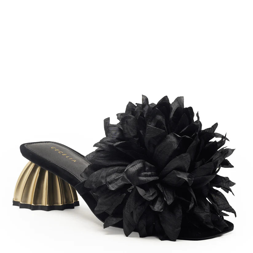 A botanical appliqué emboldens the vamp of a captivating sandal framed by a modern square toe and sculptural heel.