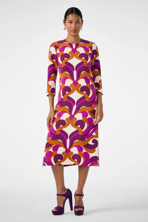 This flattering, slim dress has a classic silhouette to balance its bold, autumnal print. With a midi length and 3/4-length sleeves for ease of wear, this dress is finished with a round neckline and button closure at the back neck.
