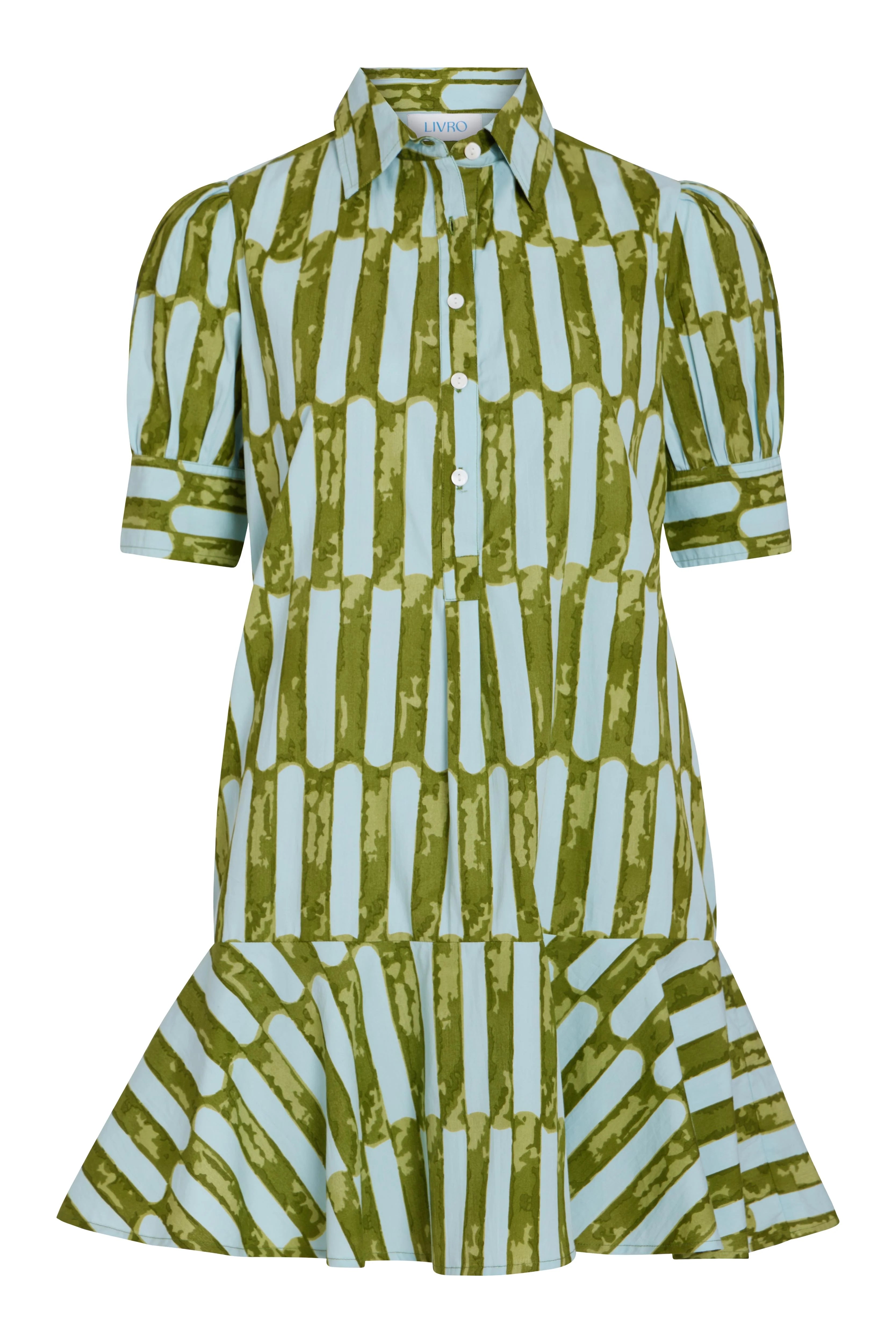 The Liv Dress is a playful mini dress with a tailored bodice and a relaxed drop-waist silhouette. It features short puff sleeves with cuff detailing, a classic shirt collar, and a partial button placket down the front. The skirt is finished with a flounced hem for a feminine, swingy shape.