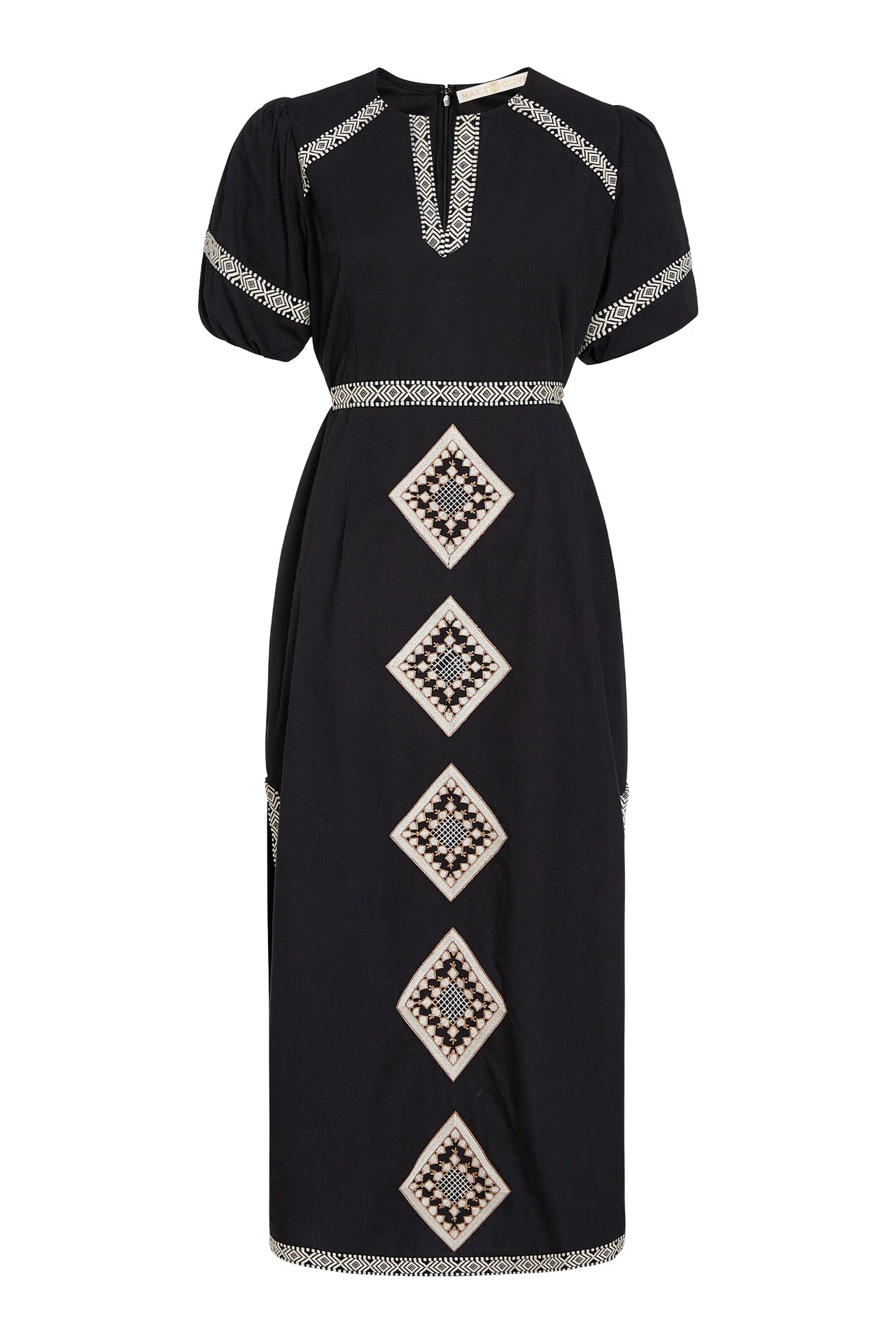 Fitted through the bust, waist, and hips, this brand-new style flatters in all the right places, but it’s the perfectly placed geometric embroidery that really elevates this sophisticated black-and-white midi dress.