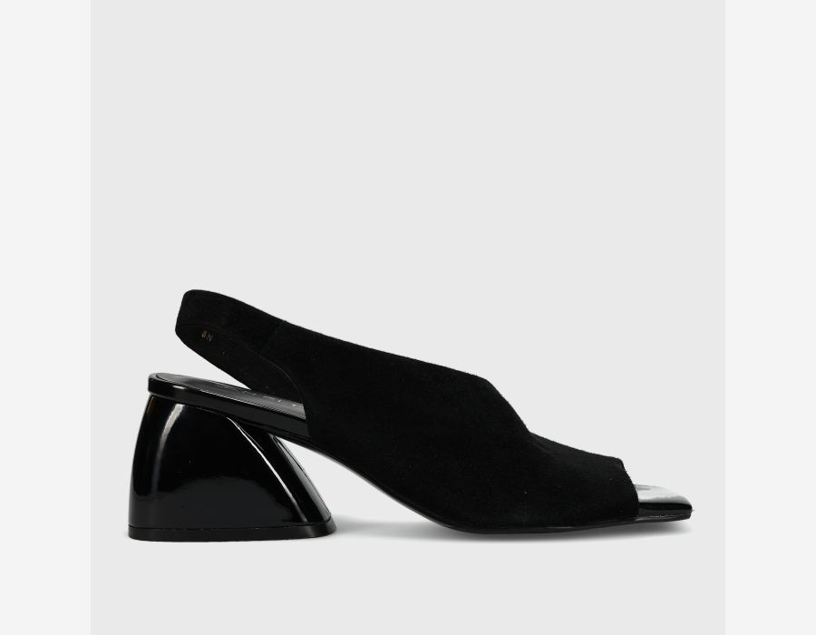 D'Orsay sandal. Patent square toe. Stretch insert on strap. 2.25 inch sculptural covered heel.
