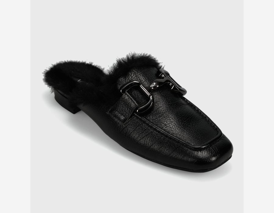 Faux fur-lined loafer mule. Square toe. Apron-style upper. Oversized metal bit. Padded insole. Half-inch covered heel.
