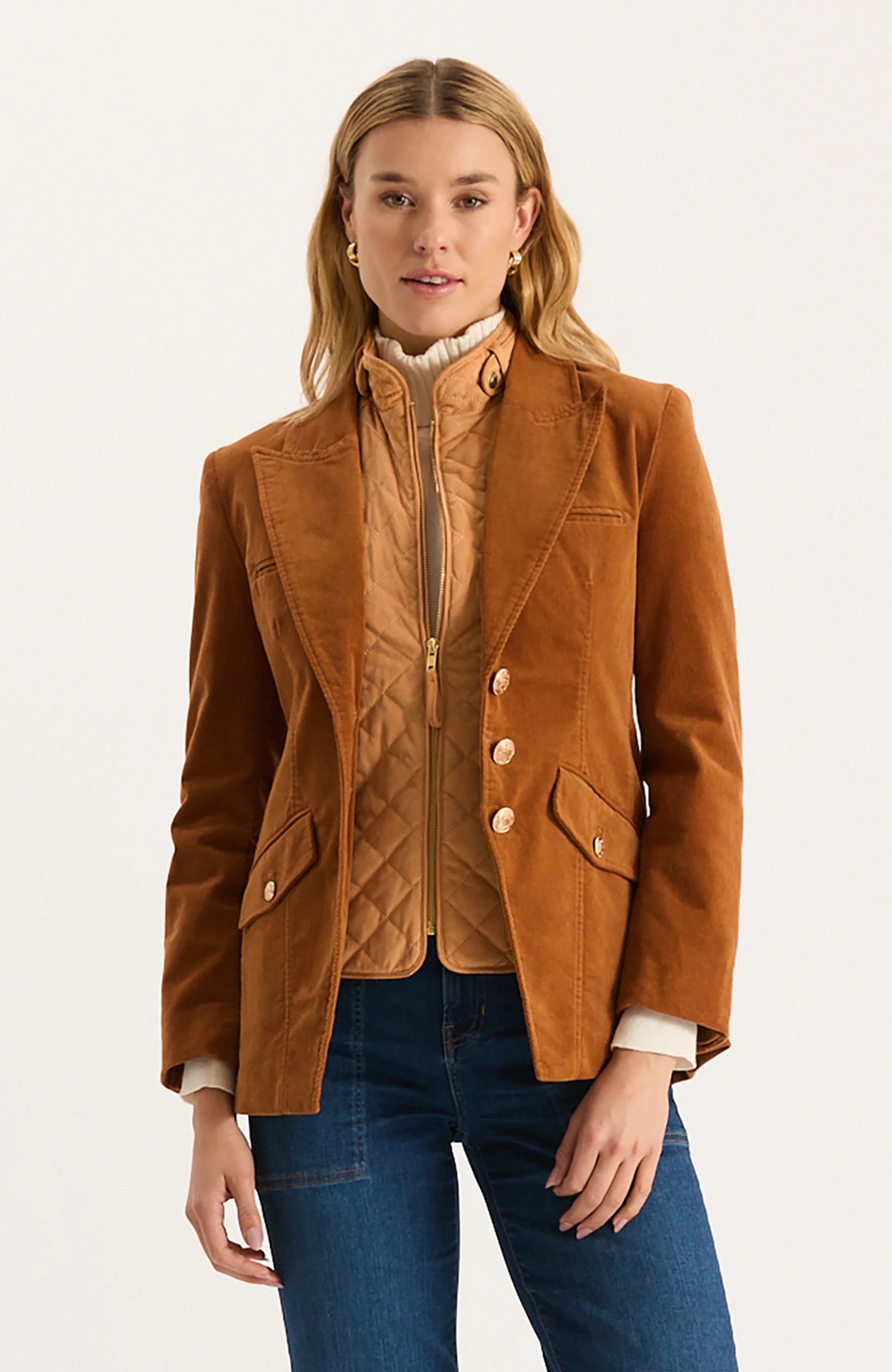 Crafted in a corduroy fabric, the Goldie Jacket has a 70s-inspired look. The silhouette features a tailored fit, gold button closures, and classic lapels that create a sophisticated and timeless style.