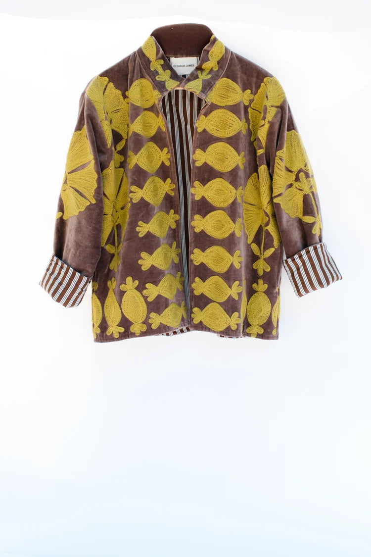 Tailored to a flattering hip length, it’s crafted from lustrous velvet and illuminated with hand-finished Suzanni embroidery—an artful interplay of texture, color, and heritage craft. The silhouette balances structure with ease, designed to slip seamlessly from evening affairs to off-duty elegance. A collector’s piece in its own right, this jacket transforms every ensemble into a composition of sophistication and style.