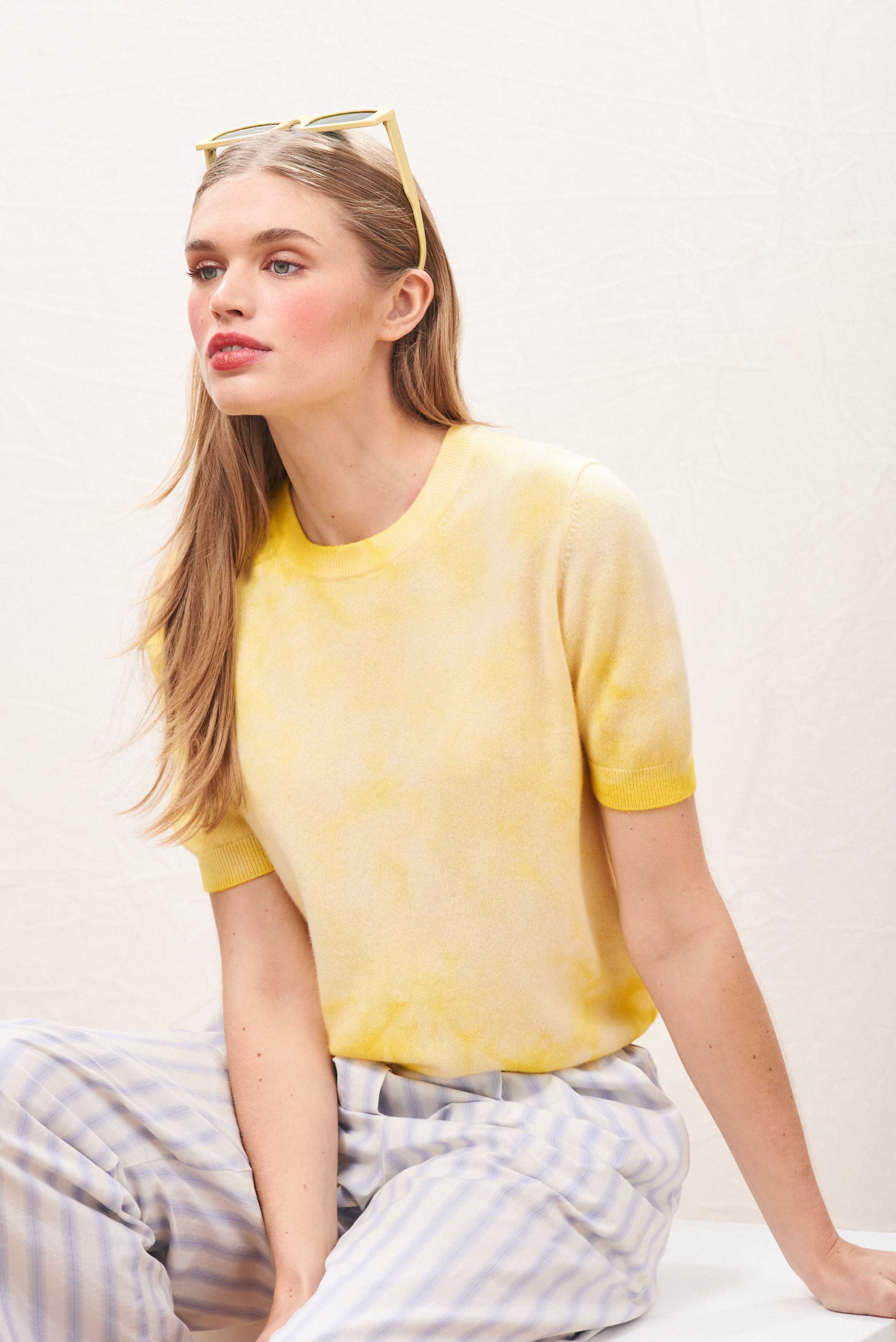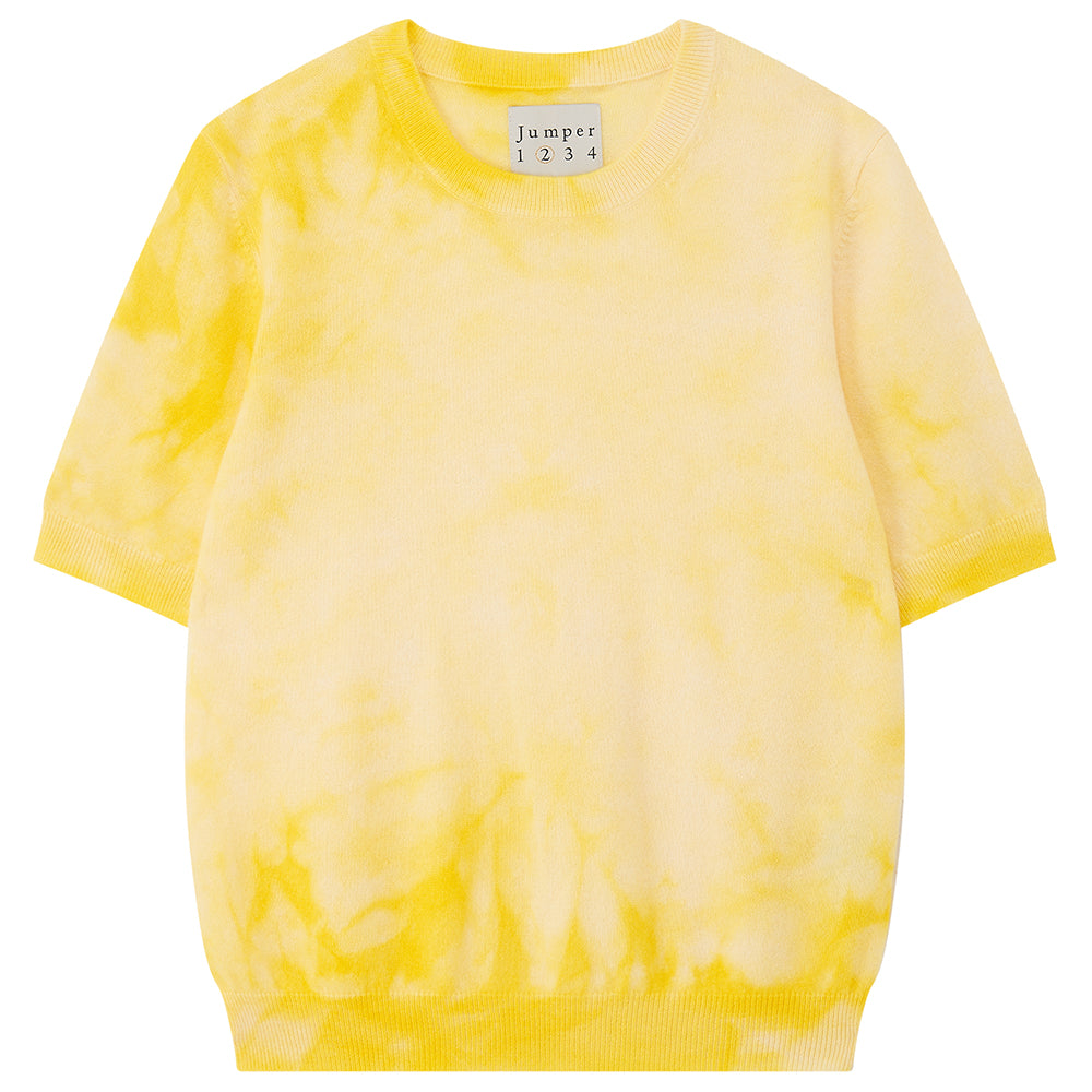 Tie dye crew neck cashmere short sleeve jumper in yellow and pale yellow. There's a matching cardigan too and a choice of 3 colours. It's true to size and we're obsessed!