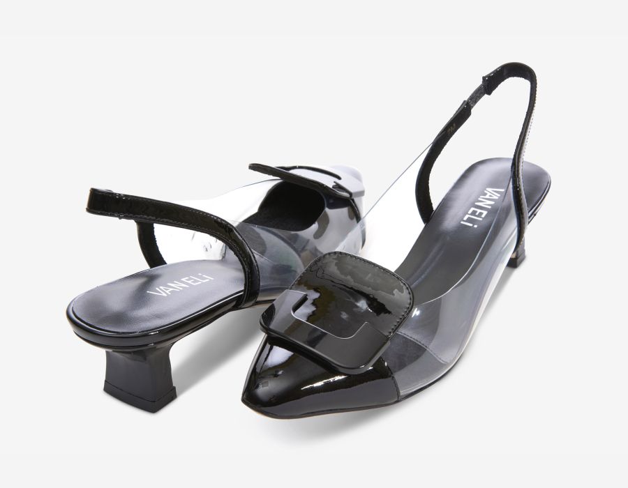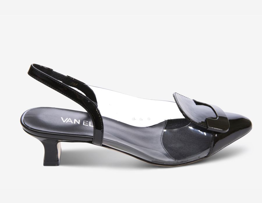 Illusion point-toe slingback pump. Patent cap and vamp ornament. Back strap with elastic insert. Padded insole. 1.75 inch covered kitten heel.
