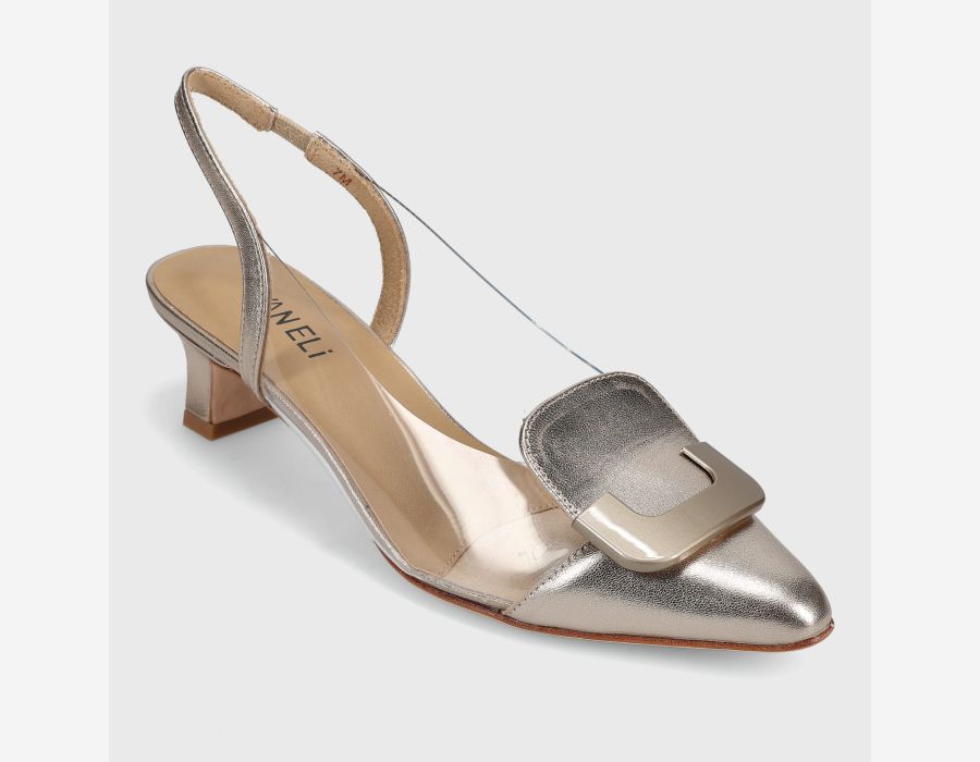 Illusion point-toe slingback pump. Patent cap and vamp ornament. Back strap with elastic insert. Padded insole. 1.75 inch covered kitten heel.